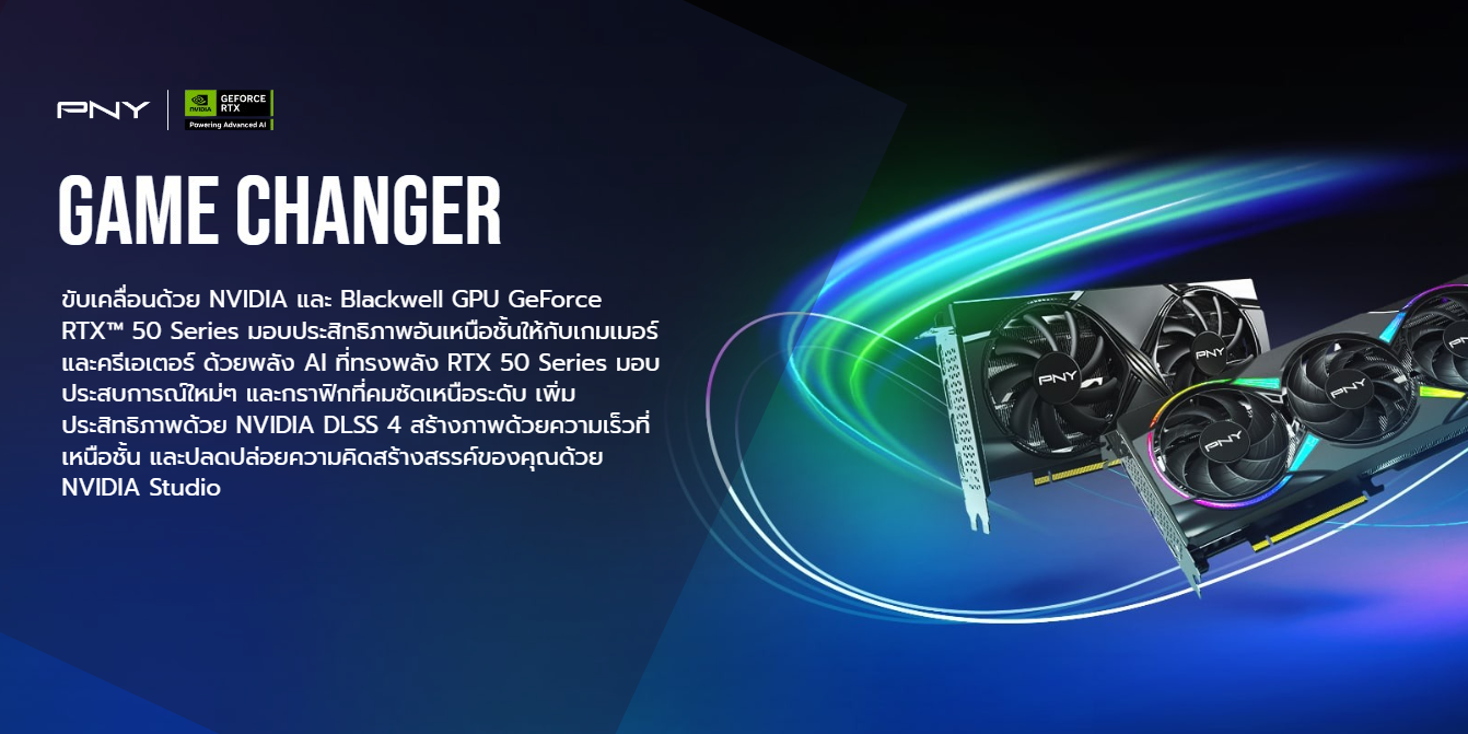 สัมผัสประสิทธิภาพที่เหนือชั้นกว่าใครด้วย PNY GeForce RTX™ 5060 ขับเคลื่อนด้วย NVIDIA® Blackwell เล่นเกมด้วยเฟรมเรตสูงด้วย DLSS 4 ยกระดับความคิดสร้างสรรค์ของคุณด้วย NVIDIA Studio และเปิดประสบการณ์ใหม่ด้วยพลัง AI